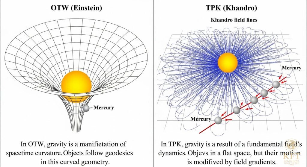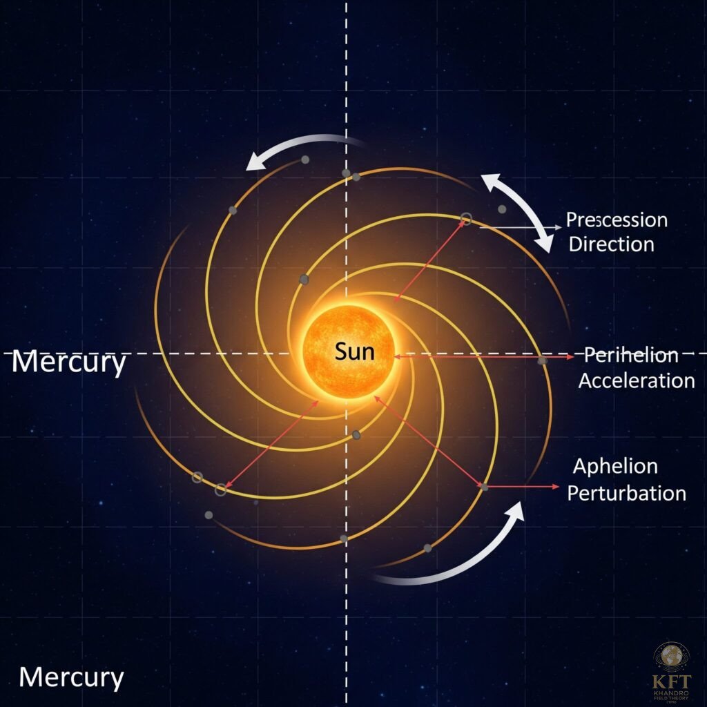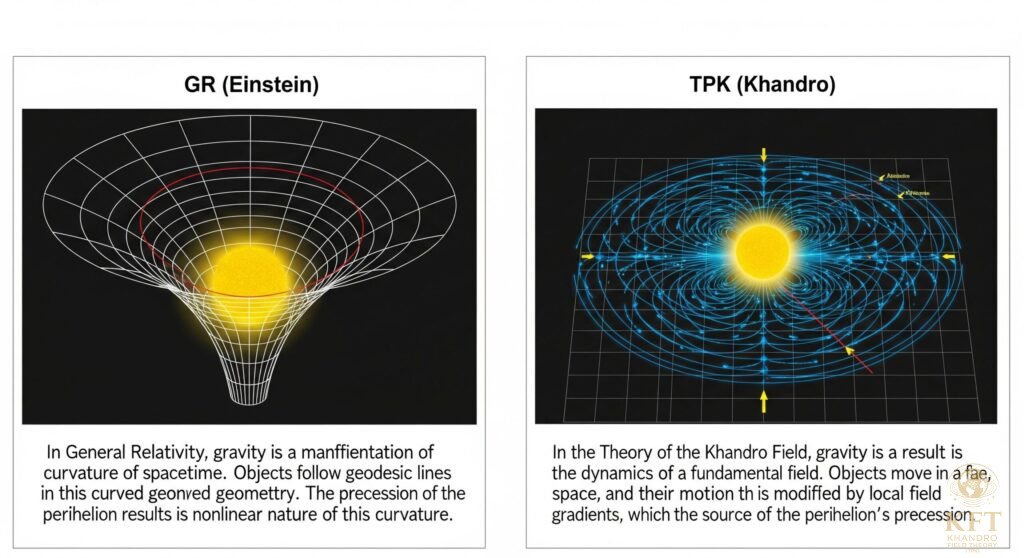 W ujęciu Teorii Pola Khandro (TPK), precesja peryhelium Merkurego nie jest efektem zakrzywienia czasoprzestrzeni, lecz wynika z dynamiki jednego, fundamentalnego pola. Grawitacja w TPK jest efektem lokalnych gradientów tego pola.